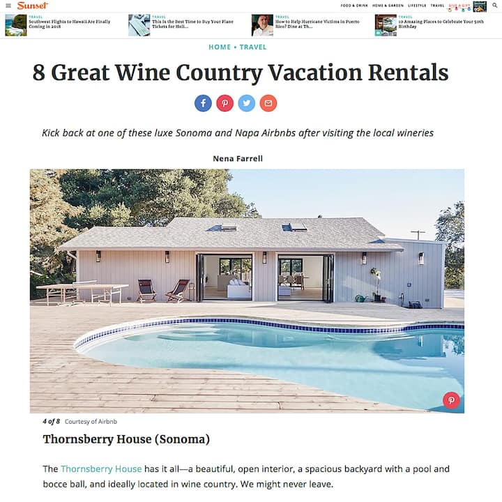 Thornsberry House is a luxe Wine Country home nestled between the 2 oldest wineries in California and just minutes from the Sonoma Square. It is renovated with a boutique hotel feel to accommodate the most discerning traveler.